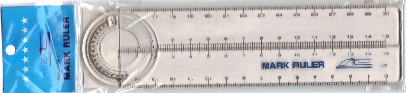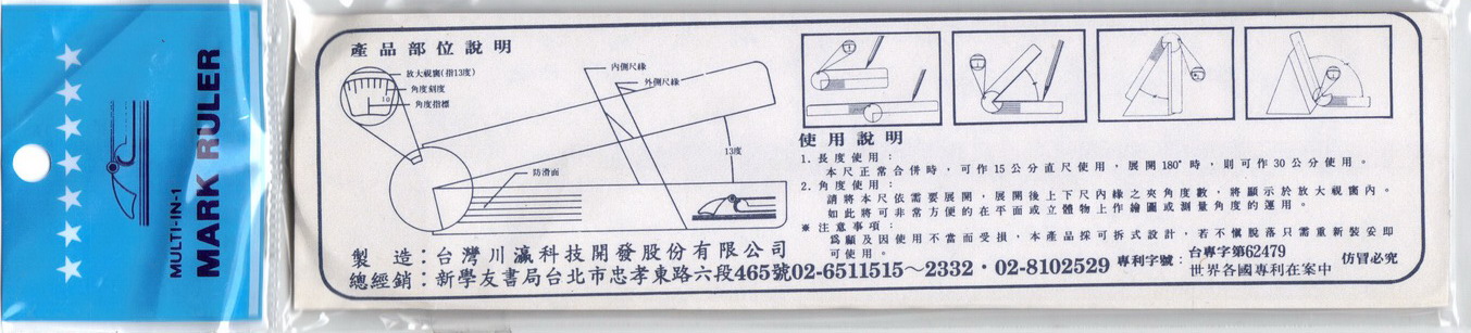 合起來是15公分的尺,展開可量角度、全開可成為30公分的直尺